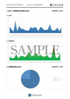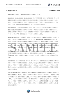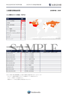 「攻撃の日時」「攻撃手法」「攻撃基点」「攻撃の数と割合」をご報告させていただくとともに、「セキュリティアドバイスプラン」においては月間の攻撃情報をもとに、今後対策してゆくべき施策についてコメントを付与させて頂いております。