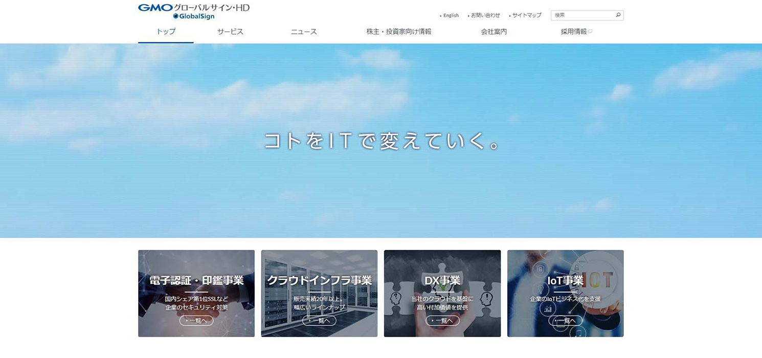 弊社はインターネットが本格普及し始めた1995年から行なってきたレンタルサーバーなどのサーバー運用のノウハウを活かし、クラウド事業などITインフラ周りのサービスを展開しています。2021年の9月からは社名を「GMOグローバルサイン・ホールディングス株式会社」に変更し、クラウドホスティング事業の強化とそれに加え電子認証事業を行なっています。